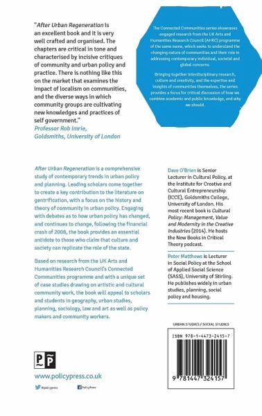 Focusing on the history and theory of community in urban policy, and including a unique set of case studies that draw on artistic and cultural community work, After urban regeneration engages with debates on how urban policy has changed and continues to change following the financial crash of 2008