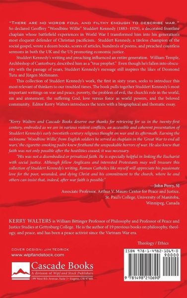""There are no words foul and filthy enough to describe war."" So declared Geoffrey ""Woodbine Willie"" Studdert Kennedy (1883-1929), a decorated frontline chaplain whose battlefield experiences in World War I transformed him into his generation's most eloquent defender of Christian pacificism. Studdert Kennedy was also a tireless champion of the social gospel who wrote a dozen books, scores of articles, hundreds of poems, and preached countless sermons in both the UK and the US promoting economic justice. Studdert Kennedy's writing and preaching influenced an entire generation. William Temple, Archbishop of Canterbury, described him as a ""true prophet."" Even though he's fallen into obscurity with the passage of years, Studdert Kennedy's message still inspires the likes of Desmond Tutu and Jurgen Moltmann. This collection of Studdert Kennedy's work, the first in sixty years, seeks to introduce this most relevant of thinkers to our troubled times. The book pulls together Studdert Kennedy's most important writings on war and peace, poverty, the problem of evil, the church's role in the world, sin and atonement, the suffering God, love versus force as world powers, and the beloved community. Editor Kerry Walters introduces the texts with a biographical and thematic essay.