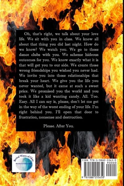 Oh, that’s right, we talk about your love life. We sit with you in class. We know all about that thing you did last night. How do we know? We watch you. We go to those dance clubs with you. We scheme hideous outcomes for you. We know exactly what it is that will get you to our side. We create those wrong friendships you wished you never had. We invite you into those relationships that break your heart. We give you the life you never wanted, but it came at such a sweet price. We promised you the world and you took it like a kid wanting candy. All. Too. Easy. All I can say is, please, don’t let me get in the way of the worst ending of your life. I’m right behind you. I’ll open that door to frustration, nonsense and destruction.