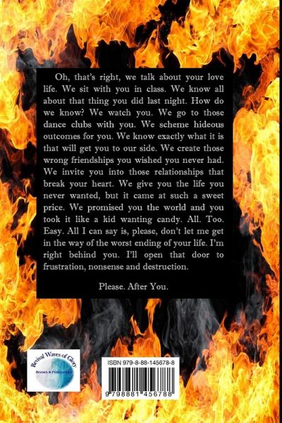 Oh, that's right, we talk about your love life. We sit with you in class. We know all about that thing you did last night. How do we know? We watch you. We go to those dance clubs with you. We scheme hideous outcomes for you. We know exactly what it is that will get you to our side. We create those wrong friendships you wished you never had. We invite you into those relationships that break your heart. We give you the life you never wanted, but it came at such a sweet price. We promised you the world and you took it like a kid wanting candy. All. Too. Easy. All I can say is, please, don't let me get in the way of the worst ending of your life. I'm right behind you. I'll open that door to frustration, nonsense and destruction. Please. After You.