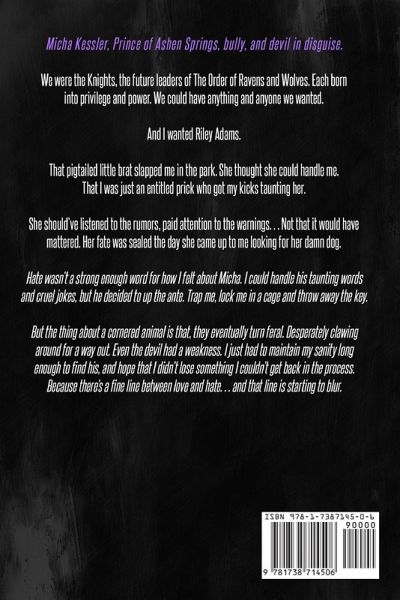 Micha Kessler, Prince of Ashen Springs, bully, and devil in disguise. We were the Knights, the future leaders of the Order of Ravens and Wolves. Each born into privilege and power. We could have anything and anyone we wanted. And I wanted Riley Adams. That pigtailed little brat slapped me in the park. She thought she could handle me. That I was just an entitled prick who got my kicks taunting her. She should've listened to the rumors, paid attention to the warnings...not that it would've mattered. Her fate was sealed the day she came up to me looking for her damn dog. Hate wasn't a strong enough word for how I felt about Micha. I could handle his taunting words and cruel jokes, but he decided to up the ante. Trap me, lock me in a cage, and throw away the key. But the thing about a cornered animal is that they eventually turn feral, desperately clawing around for a way out. Even the devil had a weakness. I just had to maintain my sanity long enough to find his, and hope that I didn't lose something I couldn't get back in the process. Because there's a fine line between love and hate...and that line is starting to blur.