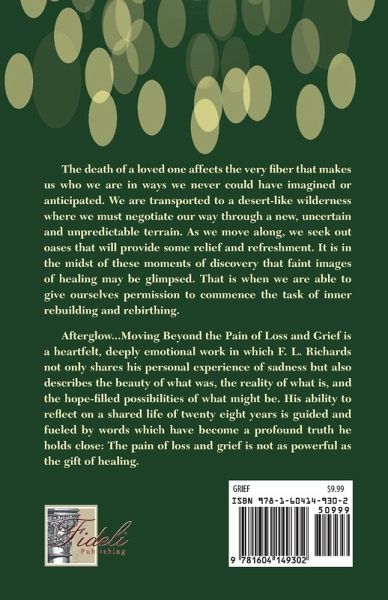 The death of a loved one affects the very fiber that makes us who we are in ways we never could have imagined or anticipated. We are transported to a desert-like wilderness where we must negotiate our way through a new, uncertain and unpredictable terrain. As we move along, we seek out oases that will provide some relief and refreshment. It is in the midst of these moments of discovery that faint images of healing may be glimpsed. That is when we are able to give ourselves permission to commence the task of inner rebuilding and rebirthing. Afterglow…Moving Beyond the Pain of Loss and Grief is a heartfelt, deeply emotional work in which F. L. Richards not only shares his personal experience of sadness but also describes the beauty of what was, the reality of what is, and the hope-filled possibilities of what might be. His ability to reflect on a shared life of twenty eight years is guided and fueled by words which have become a profound truth he holds close: The pain of loss and grief is not as powerful as the gift of healing.