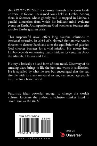 AFTERLIFE ODYSSEY is a journey through time across God's universe. It follows unassigned souls held in Limbo. Among them is Socrates, whose ghostly soul is trapped in Limbo, a parallel dimension from which his brilliant mind evaluates events on Earth. A compassionate God watches as Socrates tries to solve Earth's greatest crisis. This suspenseful novel offers long overdue solutions to irrational attitudes. In 2054 AD, alarmed that atomic bombs threaten to destroy Earth and alter the equilibrium of galaxies, God chooses Socrates for a vital mission. His release from Limbo depends on learning Truths hidden for centuries about the Afterlife, Heaven and Hell. History is basically a bland form of time travel. Discovery of his amazing diary brings to life the best and worst in civilization. He is appalled by what he sees but encouraged that the real afterlife with its many universal secrets, can encourage people to strive for a better world.