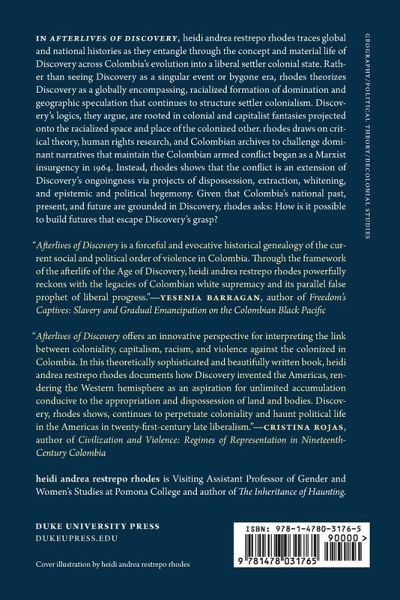 Traces global and national histories as they entangle through the concept and material life of Discovery across Colombiaâ s evolution into a liberal settler colonial state. Given that Colombiaâ s national past, present, and future are grounded in Discovery, restrepo rhodes asks How is it possible to build futures that escape Discoveryâ s grasp?