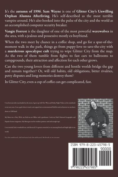 It's the autumn of 1996. Sam Wayne is one of Glitter City's Unwilling Orphan Alumna Afterliving. He's self-described as the most terrible vampire around. He's also hooked into the pulse of the city and the world as an accomplished computer security breaker. Vangie Forrest is the daughter of one of the most powerful werewolves in the area, with a jealous and possessive mostly ex-boyfriend. When the two meet by chance in a coffee shop, and go for a spur-of-the-moment walk in the park, things go from puppy-love to save-the-city with a murderous apocalypse cult trying to wipe Glitter City from the map. As the two of them tumble from fights to fast cars to ballrooms to campgrounds, their attraction and affection for each other grows. Can the two young lovers from different and hostile worlds bridge the gap and remain together? Or, will old habits, old obligations, bitter rivalries, petty disputes and long memories destroy them? In Glitter City, even a cup of coffee can get complicated, fast.