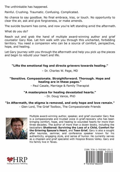 Honored by Choose Therapy, Best Books on Suicide 2021 The unthinkable has happened. Painful. Crushing. Traumatic. Confusing. Complicated. No chance to say goodbye. No final embrace, kiss, or touch. No opportunity to clear the air, ask and give forgiveness, or make amends. A life gone. The tsunami has come, and now you're left standing amid the aftermath. What do you do? Reach out and grab the hand of multiple award-winning author and grief counselor Gary Roe. Let him walk with you through this uncharted, forbidding territory. You need a companion who can be a source of comfort, perspective, hope, and healing. Let Gary journey with you through the aftermath and help you pick up the pieces and begin to rebuild your heart and life. Aftermath was written to...Connect with your heart in all the pain, grief, and confusion. Be a companion for you in this unwanted, heart-crushing process that has been thrust upon you. Be a source of comfort, perspective, healing, and peace. Provide practical tools to help you pick up the pieces and begin to rebuild your heart and life. In Aftermath, you can discover how to...Be kind to yourself and patient with yourself during this incredibly hard time. Manage the racing thoughts and volatile emotions that come. Deal with other people and the unhelpful words and weird reactions that come your way. Navigate the tough spiritual issues and faith questions that confront your soul. Grieve in healthy ways that honor the one you lost, take your own heart seriously, and express kindness and compassion to those around you. Abandon the notion of quick fixes, self-medicating relief, and the lying voice of addiction as a way out. Latch onto the truth that no one is beyond repair and that anyone can heal - including you. Use your grief as fuel for good and make this death count by living with more purpose and meaning than ever before. Save lives and become part of the solution to this raging suicide epidemic. You didn't choose this road. You woke up on day and found you were on it. You're left standing in amid the aftermath. But you are not alone. Far from it. Let Aftermath become a understanding companion for you in the days ahead.