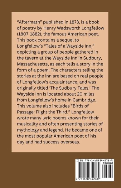 Unique Element About the Author / Historical Context A COLLECTION OF POEMS by HENRY WADSWORTH LONGFELLOW. Aftermath, by AMERICAN author HENRY WADSWORTH LONGFELLOW (1807-1882) is a sequel to the author's popular "Tales of a Wayside Inn," and depicts a group of people gathered in the tavern at the Wayside Inn in Sudbury, Massachusetts Each of the travelling companions at the inn tells a story in the form of a poem. Story-telling characters include the poet, the theologian, the student, the musician and the landlord. The tavern was located about 20 miles from Longfellow's home in Cambridge. Longfellow wrote many lyric poems known for their musicality and often presenting stories of mythology and legend. He was among the most popular American poet of his day and had success overseas. This volume includes "Birds of Passage: Flight the Third," a collection of poems including "Fata Morgana," "The Haunted Chamber," and "Aftermath." Sneak Peak When the Summer fields are mown, When the birds are fledged and flown, And the dry leaves strew the path; .... Title Details Originally published in 1873 5.5 x 8.5 inches