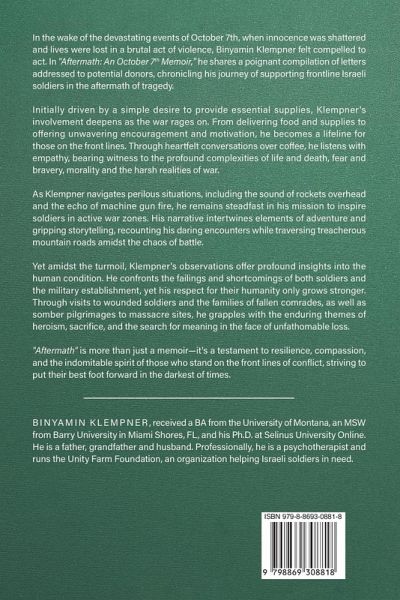 In the shadow of October 7th-a day marked by an unspeakable tragedy that shook the very foundations of innocence and peace-Binyamin Klempner embarked on an extraordinary journey of resilience and support. "Aftermath: An October 7th Memoir" unfolds the remarkable story of Klempner's mission to aid Israeli soldiers on the front lines, a testament to the unyielding human spirit in the aftermath of violence and loss. Driven by an initial desire to provide basic necessities, Klempner's commitment evolves into a profound connection with those defending their homeland. His memoir weaves together a series of powerful letters to potential donors, recounting his experiences of delivering supplies, offering moral support, and engaging in deep, empathetic conversations with soldiers facing the realities of war daily. Klempner navigates the dangers of conflict zones with courage, his narrative rich with the thrill of adventure and the weight of responsibility. Through his eyes, readers are invited into the heart of battlefields, where the sounds of rockets and gunfire underscore the urgency of his mission. Yet, it is in the quiet moments-visiting the wounded, honoring the fallen, and confronting the human cost of conflict-that Klempner's insights into bravery, sacrifice, and the search for meaning resonate most deeply. "Aftermath" is not merely a memoir; it is an exploration of the complexities of the human condition in times of war. It challenges readers to reflect on the nature of heroism, the importance of compassion, and the resilience required to stand in solidarity with those in the line of fire. Binyamin Klempner, with his rich background in psychotherapy and his leadership of the Unity Farm Foundation, brings a unique and thoughtful perspective to the narratives of war, survival, and the enduring quest for peace. Dive into "Aftermath" and join Klempner on his inspiring journey of hope, humanity, and the relentless pursuit of making a difference in the darkest times.
