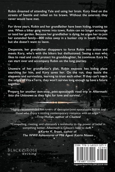 "Highly-recommended for lovers of dystopian/post-apocalyptic fiction and those who enjoy a sizzling contemporary romance with an edge." -Troy Hollan, author of Clucked Robin dreamed of attending Yale and using her brain. Kory lived on the streets of Seattle and relied on his brawn. Without the asteroid, they never would have met. For three years, Robin and her grandfather have been hiding, trusting no one. When a biker gang moves into town, Robin can no longer scrounge or tend her garden. Because her grandfather is dying, he urges her to join her extended family-800 miles away in a bunker city in South Dakota, but she doesn't want to leave. Desperate, her grandfather disappears to force Robin into action and meets Kory, who's with the bikers but disillusioned. Seeing a man who likes to read and could protect his granddaughter, he convinces Kory he can start over and accompany Robin on the long journey. Unaware of her grandfather's plan, Robin exposes her hiding place searching for him, and Kory saves her. On the run, they battle the elements and survivalists, learning to trust each other. If they can't reach the safety of Vita xTerra, they won't survive long enough to have a future together. Prepare for another non-stop, post-apocalyptic road trip in Aftermath: Into the Unknown as they fight for love and survival.