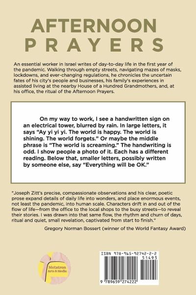 An essential worker in Israel writes of day-to-day life in the first year of the pandemic. Walking through empty streets, navigating mazes of masks, lockdowns, and ever-changing regulations, he chronicles the uncertain fates of his city's people and businesses, his family's experiences in assisted living at the nearby House of a Hundred Grandmothers, and, at his office, the ritual of the Afternoon Prayers.