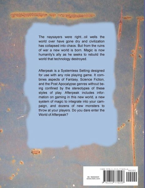 The naysayers were right...oil wells the world over have gone dry and civilization has collapsed into chaos. But from the ruins of war a new world is born. Magic is now humanity's ally as he seeks to rebuild the world that technology destroyed. Afterpeak is a Systemless Setting designed for use with any role playing game. It combines aspects of Fantasy, Science Fiction, and the Post Apocalypse genres without being confined by the stereotypes of these styles of play. Afterpeak includes information on gaming in this new world, a new system of magic to integrate into your campaign, and dozens of new monsters to throw at your players. Do you dare enter the World of Afterpeak?