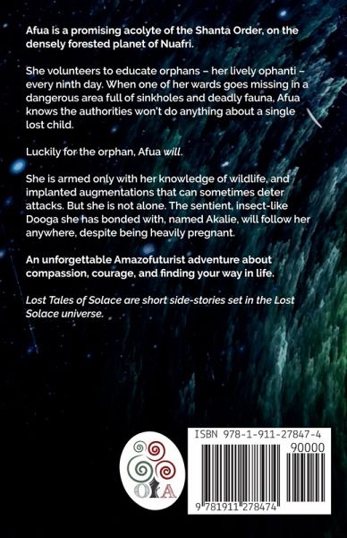 Afua is a promising acolyte of the Shanta Order, on the densely forested planet of Nuafri. She volunteers to educate orphans - her lively ophanti - every ninth day. When one of her wards goes missing in a dangerous area full of sinkholes and deadly fauna, Afua knows the authorities won't do anything about a single lost child. Luckily for the orphan, Afua will. She is armed only with her knowledge of wildlife, and implanted augmentations that can sometimes deter attacks. But she is not alone. The sentient, insect-like Dooga she has bonded with, named Akalie, will follow her anywhere, despite being heavily pregnant. An unforgettable Amazofuturist adventure about compassion, courage, and finding your way in life. Lost Tales of Solace are short side-stories set in the Lost Solace universe.