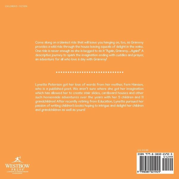 Come along on a blanket ride that will leave you hanging on, too, as Grammy provides a wild ride through the house leaving squeals of delight in the wake. One ride is never enough as she is begged to do it "Again, Grammy....Again!" A descriptive journey to spark the imagination ending with cuddles and prayer, an adventure for all who love a day with Grammy!