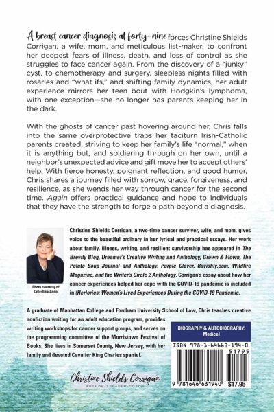 A breast cancer diagnosis at forty-nine forces Christine Shields Corrigan, a wife, mom, and meticulous list-maker, to confront her deepest fears of illness, death, and loss of control as she struggles to face cancer again. From the discovery of a "junky" cyst, to chemotherapy and surgery, sleepless nights filled with rosaries and "what ifs," and shifting family dynamics, her adult experience mirrors her teen bout with Hodgkin's lymphoma, with one exception-she no longer has parents keeping her in the dark. With the ghosts of cancer past hovering around her, Chris falls into the same overprotective traps her taciturn Irish-Catholic parents created, striving to keep her family's life "normal," when it is anything but, and soldiering through on her own, until a neighbor's unexpected advice and gift move her to accept others' help. With fierce honesty, poignant reflection, and good humor, Chris shares a journey filled with sorrow, grace, forgiveness, and resilience, as she wends her way through cancer for the second time. Again offers practical guidance and hope to individuals that they have the strength to forge a path beyond a diagnosis.