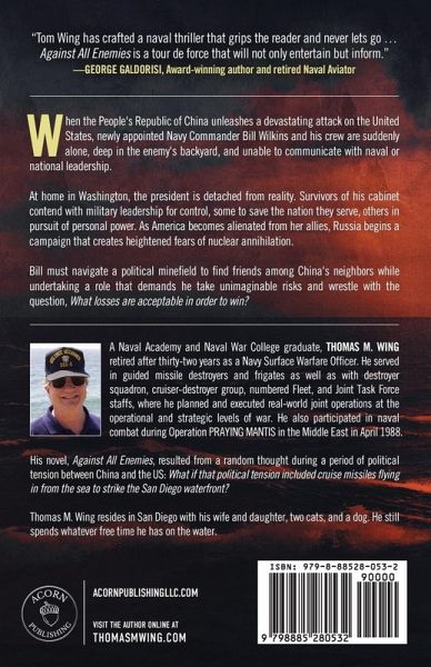 Against All Enemies is a Gold Medal winner in the Thriller category from the Military Writers Society of America, as well as a Bronze Medal winner in the Military Fiction category from the North American Book Awards, a Gold Award winner from Literary Titan, a Silver Finalist for the American Writing Awards, and a Firebird Award Winner for Best Military Fiction! When the People's Republic of China unleashes a devastating attack on the United States, newly appointed Navy Commander Bill Wilkins and his crew are suddenly alone, deep in the enemy's backyard, and unable to communicate with naval or national leadership. At home in Washington, the president is detached from reality. Survivors of his cabinet contend with military leadership for control, some to save the nation they serve, others in pursuit of personal power.As America becomes alienated from her allies, Russia begins a campaign that creates heightened fears of nuclear annihilation. Bill must navigate a political minefield to find friends among China's neighbors while undertaking a role that demands he take unimaginable risks and wrestle with the question, What losses are acceptable in order to win? Praise For Against All Enemies: "This action-packed naval thriller comes ominously close to reality in imagining the events leading up to, and into, a Third World War...the novel moves from war zones to the boardroom machinations playing out in Washington and Moscow. Action and political intrigue are woven into a taught story that equally draws from world-domination strategy games and blockbuster war films...Wing's first-hand experience in naval combat and decades of service as a Navy Surface Warfare officer are on full-display in immersive combat scenes...of real-world fighting. The combination of chaos and calm that unfolds in the command center of a naval destroyer fighting for its life is captured with uncanny reality...These clear, authentic description of modern warfare practices are thrilling...An eerie depiction of the contemporary world sliding from an imaginable military conflagration to war of an unimaginable scale, Against All Enemies is a thrilling exercise in political prophesy." -Warren Maxwell, Independent Book Reviews "In his book Against All Enemies, author Thomas Wing has provided us with a fascinating tale of what may happen if the Chinese committed a limited, surprise attack against the United States. The Chinese believed that a non-nuclear attack that significantly destroyed our ability to respond would force a wounded US to accept an immediate cease fire agreement. They were wrong, and elements of the Pacific fleet took the fight right back to them. Outnumbered, and for the most part fighting without communications and satellite assistance, Commander Bill Wilkins and the crew of the USS Nicholas wreak havoc on the Chinese navy. The author's portrayal of the naval combat kept my attention throughout the book. Anyone who enjoys reading military fiction should enjoy this book." -Bob Doerr, Military Writers Society of America