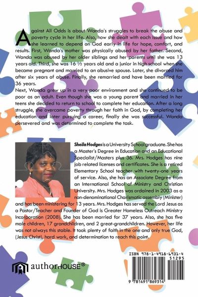 Against All Odds is about Wanda's struggles to break the abuse and poverty cycle in her life. Also, how she dealt with each issue and how she learned to depend on God early in life for hope, comfort, and results. First, Wanda's mother was physically abused by her father. Second, Wanda was abused by her older siblings and her parents until she was 13 years old. Third, she was 16 ¿ years old and a junior in high school when she became pregnant and married to an abusive spouse. Later, she divorced him after six years of abuse. Finally, she remarried and have been married for 36 years. Next, Wanda grew up in a very poor environment and she continued to be poor as an adult. Even though she was a young parent and married in teen she decided to return to school to complete her education. After a long struggle, she overcame poverty through her faith in God, by completing her education and later pursuing a career, finally she was successful. Wanda persevered and was determined to complete the task.
