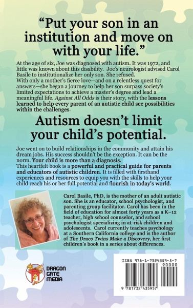 "Put your son in an institution and move on with your life." At the age of six, Joe was diagnosed with autism. It was 1972 and little was known about this disability. Joe's neurologist advised Carol Basile to institutionalize her only son. She refused. And with only a mother's fierce love and relentless quest for answers, she began a journey to help her son surpass his limited expectations and lead a meaningful life. Against All Odds is a story of an autistic child who, with courage and determination, struggles through life stages, achieving goals. It is a story of taking opportunities and never giving up. It is a story of the lessons learned to help every parent of an autistic child to see the possibilities instead of the challenges. Autism doesn't have to limit your child's potential. Joe went on to build relationships in the community, achieve a Master's Degree, and hold a regular job. His success doesn't have to be the exception. Your child can be more than their diagnosis too. This heartfelt book is a powerful and practical guide for parents and educators of autistic children. It is filled with resources and first-hand experiences to equip you with the skills to help your child flourish in today's world.