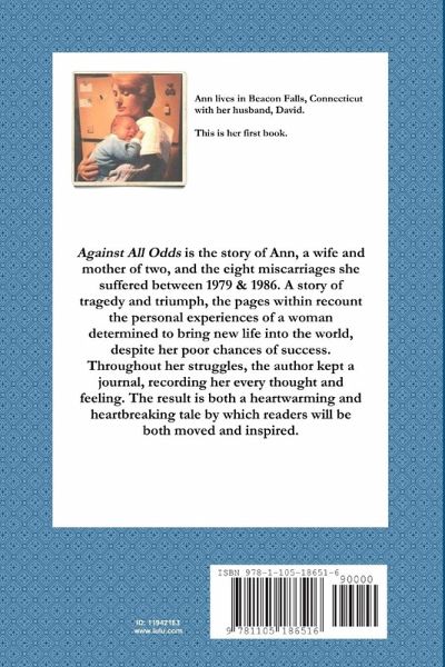Against All Odds is the story of Ann, a wife and mother of two, and the eight miscarriages she suffered between 1979 & 1986. A story of tragedy and triumph, the pages within recount the personal experiences of a woman determined to bring new life into the world, despite her poor chances of success. Throughout her struggles, the author kept a journal, recording her every thought and feeling. The result is both a heartwarming and heartbreaking tale by which readers will be both moved and inspired.