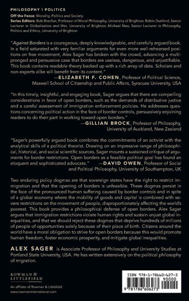 This book provides a philosophical defence of open borders. Two policy dogmas are the right of sovereign states to restrict immigration and the infeasibility of opening borders. These dogmas persist in face of the human suffering caused by border controls and in spite of a global economy where the mobility of goods and capital is combined with severe restrictions on the movement of most of the world’s poor. Alex Sager argues that immigration restrictions violate human rights and sustain unjust global inequalities, and that we should reject these dogmas that deprive hundreds of millions of people of opportunities solely because of their place of birth. Opening borders would promote human freedom, foster economic prosperity, and mitigate global inequalities. Sager contends that studies of migration from economics, history, political science, and other disciplines reveal that open borders are a feasible goal for political action, and that citizens around the world have a moral obligation to work toward open borders.