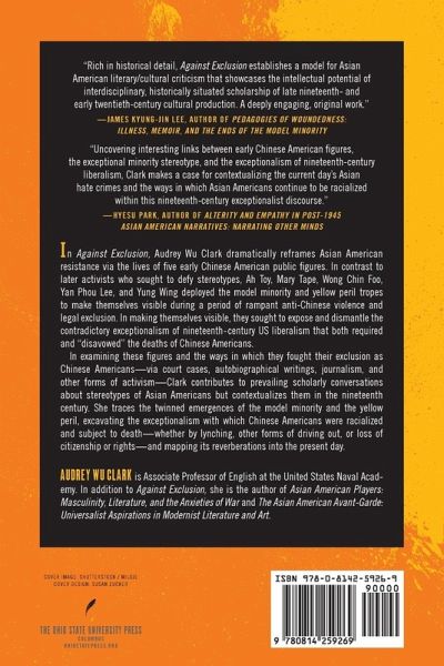 In Against Exclusion, Audrey Wu Clark dramatically reframes Asian American resistance via the lives of five early Chinese American public figures. In contrast to later activists who sought to defy stereotypes, Ah Toy, Mary Tape, Wong Chin Foo, Yan Phou Lee, and Yung Wing deployed the model minority and yellow peril tropes to make themselves visible during a period of rampant anti-Chinese violence and legal exclusion. In making themselves visible, they sought to expose and dismantle the contradictory exceptionalism of nineteenth-century US liberalism that both required and "disavowed" the deaths of Chinese Americans. In examining these figures and the ways in which they fought their exclusion as Chinese Americans-via court cases, autobiographical writings, journalism, and other forms of activism-Clark contributes to prevailing scholarly conversations about stereotypes of Asian Americans but contextualizes them in the nineteenth century. She traces the twinned emergences of the model minority and the yellow peril, excavating the exceptionalism with which Chinese Americans were racialized and subject to death-whether by lynching, other forms of driving out, or loss of citizenship or rights-and mapping its reverberations into the present day.