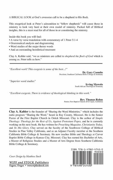 A BIBLICAL LOOK at God's awesome call to be a shepherd to His flock. This exegetical look at Peter's admonition to ""fellow shepherds"" will cause those in ministry to look very hard at their own model of ministry. Packed full of Biblical insights, this is a must read for all of those in or considering the ministry. Inside this book you will find: A verse by verse translation with commentary of 1 Peter 5:1-4 Grammatical analysis and diagramming Word studies of the major theme words And an outstanding homiletical treatment Clay A. Kahler said, ""we as ministers are called to 'shepherd the flock of God' which is among us. Peter tells us how.""
