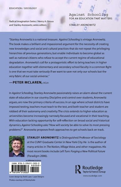 In Against Schooling, Stanley Aronowitz passionately raises an alarm about the current state of education in our country. Discipline and control over students, Aronowitz argues, are now the primary criteria of success, and genuine learning is sacrificed to a new educational militarism. In an age where school districts have imposed testing, teachers must teach to test, and both teacher and student are robbed of their autonomy and creativity. The crisis extends to higher education, where all but a few elite institutions are becoming increasingly narrowly focused and vocational in their teaching. With education lacking opportunity for self-reflection on broad social and historical dynamics, Against Schooling asks "How will society be able to solve its most pressing problems?" Aronowitz proposes innovative approaches to get schools back on track..