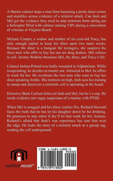 A Marine colonel stops a man from harassing a pretty diner owner and stumbles across evidence of a terrorist attack. Can Josh and Mel get the evidence they need to stop terrorists from taking out a helicopter filled with cabinet ranking VIPs during a convention of veterans at Virginia Beach. Melanie Cooper, a widow and mother of six-year-old Tracy, has only enough capital to keep her diner open two more weeks. Because the diner is a hangout for teenagers, she suspects the three men who offer to buy her out are drug dealers. Mel refuses to sell. Jeremy Watkins threatens Mel, the diner, and Tracy's life. Colonel Joshua Poland was badly wounded in Afghanistan. While recuperating, he decides to muster out. Attracted to Mel, he offers to work for her. He overhears the two men who want to buy her diner speaking Arabic. His instincts on high, Josh uses his training to snoop and discovers a terrorists cell is operating at the beach. Detective Buck Carlson believed Josh and Mel, but he's a cop. He needs evidence not vague suspicions of a marine with PTSD. When Mel is mugged and her diner catches fire, Richard Steward faces the truth that he has let his daughter down by his drinking. He promises to stay sober if she'll let him work for her. Jealous, Richard's afraid that Josh's war experience has sent him over the edge. He leaks the story of a terrorist attack to a gossip rag, sending the cell underground.