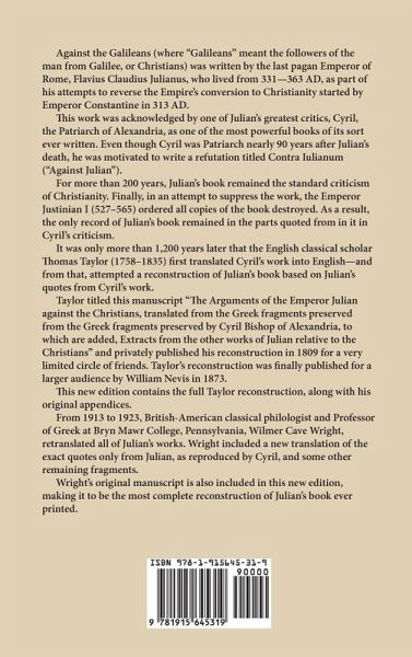 Against the Galileans (where "Galileans" meant the followers of the man from Galilee, or Christians) was written by the last pagan Emperor of Rome, Flavius Claudius Julianus, who lived from 331-363 AD, as part of his attempts to reverse the Empire's conversion to Christianity started by Emperor Constantine in 313 AD. This work was acknowledged by one of Julian's greatest critics, Cyril, the Patriarch of Alexandria, as one of the most powerful books of its sort ever written. Even though Cyril was Patriarch nearly 90 years after Julian's death, he was motivated to write a refutation titled Contra Iulianum ("Against Julian"). For more than 200 years, Julian's book remained the standard criticism of Christianity. Finally, in an attempt to suppress the work, the Emperor Justinian I (527-565) ordered all copies of the book destroyed. As a result, the only record of Julian's book remained in the parts quoted from in it in Cyril's criticism. It was only more than 1,200 years later that the English classical scholar Thomas Taylor (1758-1835) first translated Cyril's work into English-and from that, attempted a reconstruction of Julian's book based on Julian's quotes from Cyril's work. Taylor titled this manuscript "The Arguments of the Emperor Julian against the Christians, translated from the Greek fragments preserved from the Greek fragments preserved by Cyril Bishop of Alexandria, to which are added, Extracts from the other works of Julian relative to the Christians" and privately published his reconstruction in 1809 for a very limited circle of friends. Taylor's reconstruction was finally published for a larger audience by William Nevis in 1873. This new edition contains the full Taylor reconstruction, along with his original appendices. From 1913 to 1923, British-American classical philologist and Professor of Greek at Bryn Mawr College, Pennsylvania, Wilmer Cave Wright, retranslated all of Julian's works. Wright included a new translation of the exact quotes only from Julian, as reproduced by Cyril, and some other remaining fragments. Wright's original manuscript is also included in this new edition, making it to be the most complete reconstruction of Julian's book ever printed.
