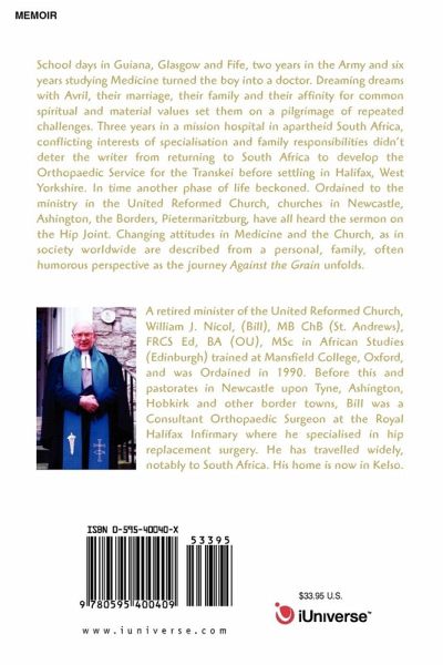 School days in Guiana, Glasgow and Fife, two years in the Army and six years studying Medicine turned the boy into a doctor. Dreaming dreams with Avril, their marriage, their family and their affinity for common spiritual and material values set them on a pilgrimage of repeated challenges. Three years in a mission hospital in apartheid South Africa, conflicting interests of specialization and family responsibilities didn't deter the writer from returning to South Africa to develop the Orthopaedic Service for the Transkei before settling in Halifax, West Yorkshire. In time another phase of life beckoned. Ordained to the ministry in the United Reformed Church, churches in Newcastle, Ashington, the Borders, Pietermaritzburg, have all heard the sermon on the Hip Joint. Changing attitudes in Medicine and the Church, as in society worldwide are described from a personal, family, often humorous perspective as the journey Against the Grain unfolds.