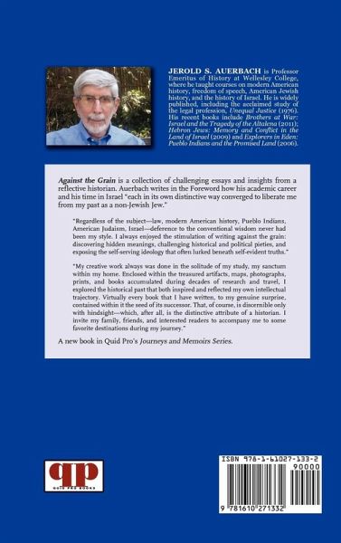 AGAINST THE GRAIN is a collection of challenging and insightful essays from a reflective historian. Jerold Auerbach, Professor Emeritus at Wellesley College (where he taught for 40 years and formerly served as the chair of its history department), writes in the Foreword how his academic career and his time in Israel "each in its own distinctive way converged to liberate me from my past as a non-Jewish Jew." He adds: "Regardless of the subject-law, modern American history, Pueblo Indians, American Judaism, Israel-deference to the conventional wisdom never had been my style. I always enjoyed the stimulation of writing against the grain: discovering hidden meanings, challenging historical and political pieties, and exposing the self-serving ideology that often lurked beneath self-evident truths. Providing intellectual catnip, it also enabled me to reach readers far beyond the narrow confines of academic journals." Furthermore: "My creative work always was done in the solitude of my study, my sanctum within my home. Enclosed within the treasured artifacts, maps, photographs, prints, and books accumulated during decades of research and travel, I explored the historical past that both inspired and reflected my own intellectual trajectory. Virtually every book I have written, to my genuine surprise, contained within it the seed of its successor. That, of course, is discernible only with hindsight-which, after all, is the distinctive attribute of a historian. I invite my family, friends, and interested readers to accompany me to some favorite destinations during my journey." A new book in Quid Pro's Journeys & Memoirs Series, AGAINST THE GRAIN presents this distinctive hindsight in essays and excerpts targeted to a general audience interested in such issues, in addition to historians, journalists, and college students. Many of the essays were first published in non-academic periodicals and are accessible to this broader audience, though they are nonetheless supported with the prodigious research, evocative prose, and candor of a widely published writer.