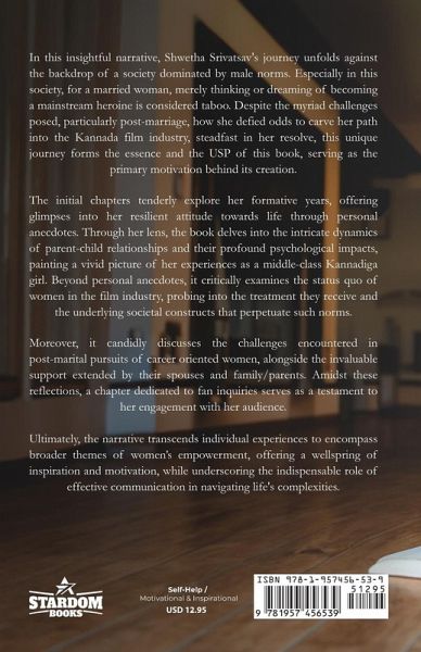 In this insightful narrative, Shwetha Srivatsav's journey unfolds against the backdrop of a society dominated by male norms. Especially in this society, for a married woman, merely thinking or dreaming of becoming a mainstream heroine is considered taboo . Despite the myriad challenges posed, particularly post-marriage, how she defied odds to carve her path into the Kannada film industry, steadfast in her resolve, this unique journey forms the essence and the USP of this book, serving as the primary motivation behind its creation. The initial chapters tenderly explore her formative years, offering glimpses into her resilient attitude towards life through personal anecdotes. Through her lens, the book delves into the intricate dynamics of parent-child relationships and their profound psychological impacts, painting a vivid picture of her experiences as a middle-class Kannadiga girl. Beyond personal anecdotes, it critically examines the status quo of women in the film industry, probing into the treatment they receive and the underlying societal constructs that perpetuate such norms. Moreover, it candidly discusses the challenges encountered in post-marital pursuits of career oriented women , alongside the invaluable support extended by her husband and family/parents. Amidst these reflections, a chapter dedicated to fan inquiries serves as a testament to her engagement with her audience. Ultimately, the narrative transcends individual experiences to encompass broader themes of women's empowerment, offering a wellspring of inspiration and motivation, while underscoring the indispensable role of effective communication in navigating life's complexities.