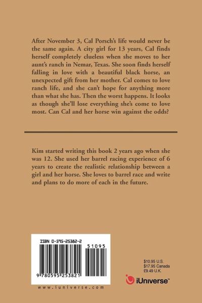 After November 3, Cal Porsch's life would never be the same again. A city girl for 13 years, Cal finds herself completely clueless when she moves to her aunt's ranch in Nemar,Texas. She soon finds herself falling in love with a beautiful black horse, an unexpected gift from her mother. Cal comes to love ranch life, and she can't hope for anything more than what she has. Then the worst happens. It looks as though she'll lose everything she's come to love most. Can Cal and her horse win against the odds?