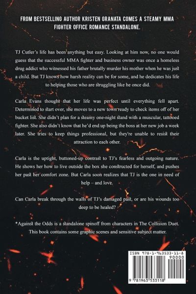 From bestselling author Kristen Granata comes a steamy MMA fighter office romance standalone. TJ Cutler's life has been anything but easy. Looking at him now, no one would guess that the successful MMA fighter and business owner was once a homeless drug addict who witnessed his father brutally murder his mother when he was just a child. But TJ knows how harsh reality can be for some, and he dedicates his life to helping those who are struggling like he once did. Carla Evans thought that her life was perfect until everything fell apart. Determined to start over, she moves to a new town ready to check items off of her bucket list. She didn't plan for a steamy one-night stand with a muscular, tattooed fighter. She also didn't know that he'd end up being the boss at her new job a week later. She tries to keep things professional, but they're unable to resist their attraction to each other. Carla is the uptight, buttoned-up contrast to TJ's fearless and outgoing nature. He shows her how to live outside the box she constructed for herself, and pushes her past her comfort zone. But Carla soon realizes that TJ is the one in need of help - and love. Can Carla break through the walls of TJ's damaged past, or are his wounds too deep to be healed? *Against the Odds is a standalone spinoff from characters in The Collision Duet. This book contains some graphic scenes and sensitive subject matter.