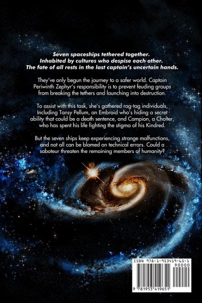 Seven spaceships tethered together. Inhabited by cultures who despise each other. The fate of all rests in the last captain's uncertain hands. They've only begun the journey to a safer world. Captain Periwinth Zephyr's responsibility is to prevent feuding groups from breaking the tethers and launching into destruction. To assist with this task, she's gathered rag-tag individuals, Including Tansy Pellum, an Embroid who's hiding a secret ability that could be a death sentence, and Campion, a Cholter, who has spent his life fighting the stigma of his Kindred. But the seven ships keep experiencing strange malfunctions, and not all can be blamed on technical errors. Could a saboteur threaten the remaining members of humanity?