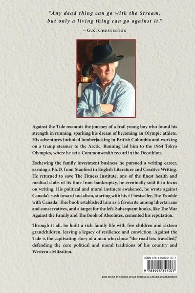 Against the Tide recounts the journey of a frail young boy who found his strength in running, sparking his dream of becoming an Olympic athlete.His adventures included lumberjacking in British Columbia and working on a tramp steamer to the Arctic. Running led him to the 1964 Tokyo Olympics, where he set a Commonwealth record in the Decathlon.Eschewing the family investment business he pursued a writing career, earning a Ph.D. from Stanford in English Literature and Creative Writing. He returned to save The Fitness Institute, one of the finest health and medical clubs of its time from bankruptcy, he eventually sold it to focus on writing. His political and moral instincts awakened, he wrote against Canada's rush toward socialism, starting with his #1 bestseller, The Trouble with Canada . This book established him as a favourite among libertarians and conservatives, and a target for the left. Subsequent books, like The War Against the Family and The Book of Absolutes, cemented his reputation.Through it all, he built a rich family life with five children and sixteen grandchildren, leaving a legacy of resilience and conviction. Against the Tide is the captivating story of a man who chose "the road less travelled," defending the core political and moral traditions of his country and Western civilization.