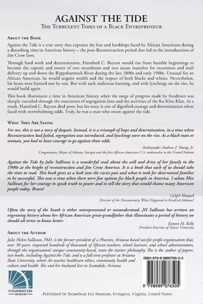 Against the Tide is a true story that captures the fear and hardships faced by African Americans during a disturbing time in American history - the post-Reconstruction period that led to the introduction of Jim Crow laws. Through hard work and determination, Hansford C. Bayton would rise from humble beginnings to become the captain and owner of two steamboats, a steam powered launch and a gas-powered launch that were used for excursions and mail delivery. The boats primarily plied the Rappahannock River but did transit the entire Chesapeake Bay from Baltimore to Norfolk during the late 1800s and early 1900s. Unusual for an African American, he would acquire wealth and respect of both blacks and whites. Nevertheless, his boats were burned one by one. But with each malicious burning, and with lynchings on the rise, he would build again. This book illuminates a time in American history when the surge of progress made by freedmen was sharply curtailed through the enactment of segregation laws and the activities of the Ku Klux Klan. As a result, Hansford C. Bayton died poor, but his story is one of dignified courage and determination when faced with overwhelming odds. Truly, he was a man who swam against the tide. Foreword by Ambassador Andrew J. Young, Jr.