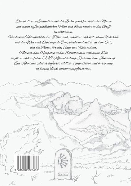 Durch diverse Ereignisse aus der Bahn geworfen, versucht Marco mit einem außergewöhnlichen Plan sein Leben wieder in den Griff zu bekommen.Von seinem Heimatort in der Pfalz aus, macht er sich mit seinem Fahrrad auf den Weg nach Santiago de Compostela und weiter zu dem Ort, den die Römer für das Ende der Welt hielten.Mit nur dem Nötigsten in den Satteltaschen und einem Zelt begibt er sich auf eine 2225 Kilometer lange Reise auf dem Jakobsweg. Ein Abenteuer, das er äußerst bildlich, sympathisch und kurzweilig in diesem Buch zusammengefasst hat.