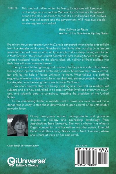 Prominent Houston reporter Lynn McCane is exhausted when she boards a flight from Los Angeles to Houston. Stretched to her limits after working on a feature series for the past three months, all Lynn wants to do is sleep. Sitting next to her is Matt Grayson, Hollywood's latest heartthrob; he's looking forward to a much-coveted weekend respite. As the plane takes off, neither of them realizes that their lives will soon change forever. Their plane is hit by lightning and crashes into the pine woods of East Texas, leaving Lynn injured and Matt profoundly shaken. Somehow they have survived, but only by the help of forces unknown to them. What follows is a baffling sequence of events-Matt is told Lynn has died, and yet encounters her again in Los Angeles, now believing her name is Linda McGowan. They soon discover they are being used against their will as medical test subjects and are now embroiled in a conspiracy that involves government cover-ups, and scientific data-a conspiracy targeting the president of the United States. In this compelling thriller, a reporter and a movie star must embark on a dangerous journey to stop those determined to gain control of an unthinkably powerful force.