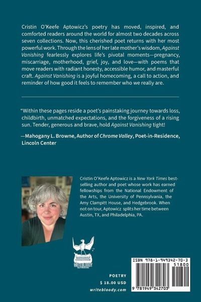 Seven years after her last book-and with a lot of love, loss, and an entire pandemic in between-this beloved poet returns. Through the lens of her late mother's wisdom, Against Vanishing digs deep as Aptowicz explores with radiant honesty the twists and turns of a life fully lived: pregnancy, miscarriage, motherhood, grief, joy, laughter, and sex. Nothing is off limits to this poet at the top of her craft. Against Vanishing is a joyful homecoming, a call to action, and a reminder of how good it feels to remember who we really are.