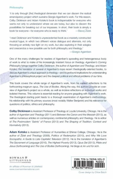 Acknowledgments Abbreviations Introduction, Adam Kotsko and Colby Dickinson Part I: Agamben as a Reader of Benjamin 1. On the 'Coming Philosophy', Colby Dickinson 2. Reading the 'Critique of Violence', Adam Kotsko 3. Gestures of Text and Violence, Colby Dickinson 4. Citing 'Whatever' Authority, Colby Dickinson Part II: Futures of Political Theology 5. Immanence as Revelation, Colby Dickinson 6. Agamben's Messianic Nihilism, Colby Dickinson 7. The Divisions of Sovereignty, Colby Dickinson 8. Perhaps Psychoanalysis?, Adam Kotsko Part III: Methods, Economies, Theologies 9. Genealogy and Political Theology, Adam Kotsko 10. The 'Absence' of Gender, Colby Dickinson 11. The Theology of Neoliberalism, Adam Kotsko 12. Cur Deus Homo Sacer?, Colby Dickinson 13. Paul and the Jewish Alternative, Adam Kotsko 14. What is to be Done? The Endgame of the Homo Sacer Series, Adam Kotsko 15. Conclusion: Finding a New Use for Theology, Colby Dickinson and Adam Kotsko Bibliography Index