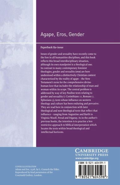 Issues of gender and sexuality have recently come to the fore in all humanities disciplines, and this book reflects this broad interdisciplinary situation, although its own standpoint is broadly theological. In contrast to many contemporary feminist theologies, gender and sexuality (eros) are here understood within a distinctively Christian context characterized by the reality of agape - the New Testament's term for the comprehensive divine-human love that includes the relationship of man and woman within its scope. The central problem is concern with key Pauline texts relating to gender and sexuality (1 Cor. 11, Rom. 7, Eph. 5), texts whose influence on western theology and culture has been enduring and pervasive. They are read here in conjunction with later theological and non-theological texts that reflect that influence - ranging from Augustine and Barth to Virginia Woolf, Freud and Irigaray.
