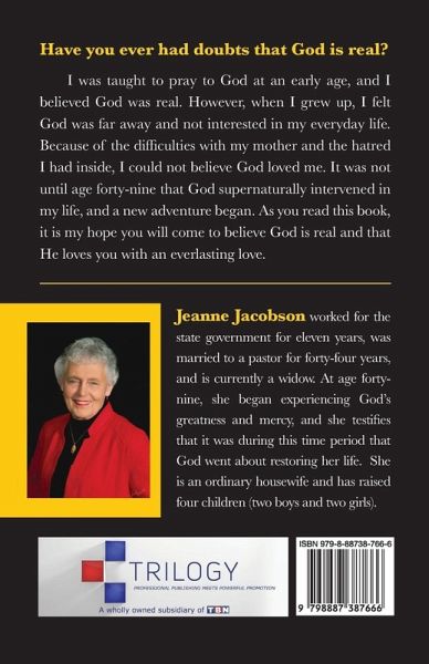 Have you ever had doubts that God is real? I was taught to pray to God at an early age, and I believed God was real. However, when I grew up, I felt God was far away and not interested in my everyday life. Because of the difficulties with my mother and the hatred I had inside, I could not believe God loved me. It was not until age forty-nine that God supernaturally intervened in my life, and a new adventure began. As you read this book, it is my hope you will come to believe God is real and that He loves you with an everlasting love.