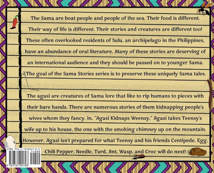 In, "Agasi Kidnaps Weensy," Agasi takes Teensy's wife up to his house, the one with the smoking chimney up on the mountain. However, Agasi isn't prepared for what Teensy and his friends Centipede, Egg, Chili Pepper, Needle, Turd, Ant, Wasp, and Croc will do next! This title is from Kauman Sama Online's Sama Stories series.