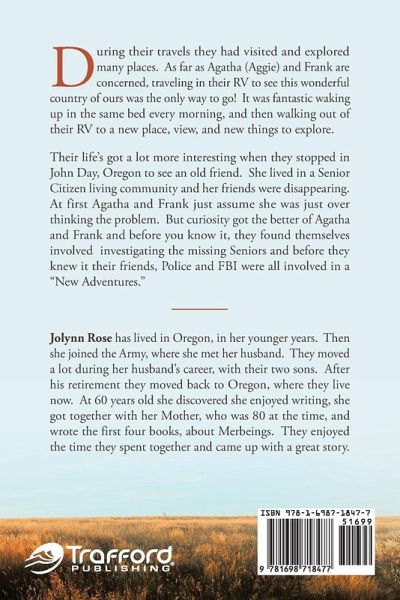 During their travels they had visited and explored many places. As far as Agatha (Aggie) and Frank are concerned, traveling in their RV to see this wonderful country of ours was the only way to go! It was fantastic waking up in the same bed every morning, and then walking out of their RV to a new place, view, and new things to explore. Their life's got a lot more interesting when they stopped in John Day, Oregon to see an old friend. She lived in a Senior Citizen living community and her friends were disappearing. At first Agatha and Frank just assume she was just over thinking the problem. But curiosity got the better of Agatha and Frank and before you know it, they found themselves involved investigating the missing Seniors and before they knew it their friends, Police and FBI were all involved in a "New Adventures."