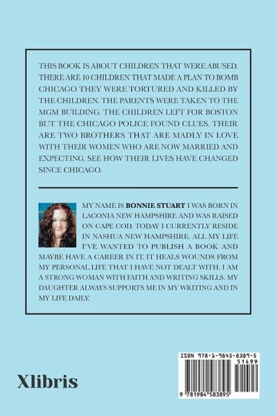 THIS BOOK IS ABOUT CHILDREN THAT WERE ABUSED. THERE ARE 10 CHILDREN THAT MADE A PLAN TO BOMB CHICAGO THEY WERE TORTURED AND KILLED BY THE CHILDREN. THE PARENTS WERE TAKEN TO THE MGM BUILDING. THE CHILDREN LEFT FOR BOSTON BUT THE CHICAGO POLICE FOUND CLUES. THEIR ARE TWO BROTHERS THAT ARE MADLY IN LOVE WITH THEIR WOMEN WHO ARE NOW MARRIED AND EXPECTING . SEE HOW THEIR LIVES HAVE CHANGED SINCE CHICAGO.