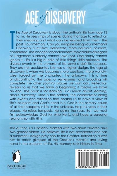 The Age of Discovery is about the author's life from age 13 to 16. He uses strips of scenes during that age to reflect on their meaning and what can be learned from them. The past is our memory. Can you imagine losing your memory? Discvery is intuitive, deliberate, more cautious, prudent, considered. The innocent abandonment, the childlike disregard of judgement suddenly cannot take root. One simply cannot ignore it. Life is a big bundle of little things, little episodes. The diverse events in the universe of life serve a definite purpose. They are not accidental. Life has a higher design, the age of discovery is when we become more cautious, more worldly-wise, forced by the uncharted, the unknown. it is a time of discontinuity. The ages of restlessness, and brooding will complete the other youthful places we can look. Reflection reveals to us that we have a beginning; it follows we have an end. The book is for learning, is as much about learning, about discovery. Time is the partner, the collaborator along with events and reflection that enable us to have a view of life's blueprint and God's hand in it. God is the primary cause of all that happens in life, in the universe. He puts rulers in their places, He raises tempests, He cals the seas. But, we must first acknowledge God for what He is, and have a personal relationship with Him.