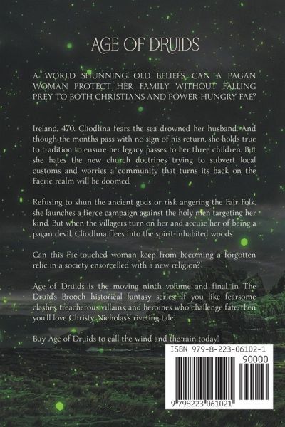 A world in turmoil. A new religion. A struggling community. Can a pagan woman protect her family without falling prey to both Christians and power-hungry Fae? Ireland, 470. In an ancient world torn between old traditions and new beliefs, a pagan woman finds herself caught in a perilous struggle to protect her family from the clutches of both zealous Christians and power-hungry Fae. Clíodhna mourns the presumed loss of her husband, and as the months pass with no sign of his return, she clings to her ancestral customs. She distrusts the encroaching dominance of the burgeoning Christian faith, which threatens to erode the connection to the Faerie realm that is intrinsic to her people's existence. Determined to preserve the ancient gods and defy those who seek to diminish their power, Clíodhna embarks on a fierce crusade against the zealous clergy who target her beliefs. As tensions escalate and her village turns against her, branding her a pagan devil, Clíodhna is left with no choice but to flee into the misty woods, where the spirits of the land dwell. In the heart of Faerie, Clíodhna must navigate a treacherous path as she grapples with her own heritage and the encroaching threats from her rivals. Will she find the strength to defy her enemies and carve a path for herself and her family, or will she become a forgotten relic in a world consumed by the allure of a foreign faith? Age of Druids is the thrilling ninth and final installment in The Druid's Brooch historical fantasy series. If you crave strong female characters and enchanting worlds where the forces of light and darkness collide, then you'll adore this riveting adventure. Read Age of Druids to embark on a remarkable journey that will ignite your imagination! Each book in The Druid's Brooch series can be read in any order as a standalone historical fantasy, allowing you to embark on any mesmerizing journey that calls to your soul.
