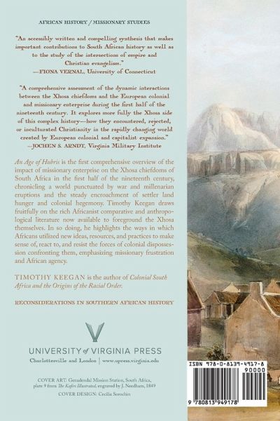 An Age of Hubris is the first comprehensive overview of the impact of missionary enterprise on the Xhosa chiefdoms of South Africa in the first half of the nineteenth century, chronicling a world punctuated by war and millenarian eruptions, and the steady encroachment of settler land hunger and colonial hegemony. With it, Timothy Keegan contributes new approaches to Xhosa history and, most important, a new dimension to the much-trodden but still vital topic of the impact-cultural, social, and political-of missionary activity among African peoples. The most significant historical works on the Xhosa have either become dated, foreground imperial-colonial history, or remain heavily theoretical in nature. In contrast, Keegan draws fruitfully on the rich Africanist comparative and anthropological literature now available, as well as extant primary sources, to foreground the Xhosa themselves in this crucial work. In so doing, he highlights the ways in which Africans utilized new ideas, resources, and practices to make sense of, react to, and resist the forces of colonial dispossession confronting them, emphasizing missionary frustration and African agency.