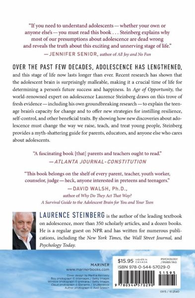 "Simply the best book I have ever read about adolescence. . . With gentle wisdom, Steinberg guides us through truly novel findings on what happens during adolescence and tells us how, as parents and teachers, we should change our ways." -- Martin E. P. Seligman, Ph. D., author of The Optimistic Child "If you need to understand adolescents--whether your own or anyone else's--you must read this book . . . Steinberg explains why most of our presumptions about adolescence are dead wrong and reveals the truth about this exciting and unnerving stage of life."--Jennifer Senior, author of All Joy and No Fun Over the past few decades, adolescence has lengthened, and this stage of life now lasts longer than ever. Recent research has shown that the adolescent brain is surprisingly malleable, making it a crucial time of life for determining a person's future success and happiness. In Age of Opportunity, the world-renowned expert on adolescence Laurence Steinberg draws on this trove of fresh evidence--including his own groundbreaking research--to explain the teenage brain's capacity for change and to offer new strategies for instilling resilience, self-control, and other beneficial traits. By showing how new discoveries about adolescence must change the way we raise, teach, and treat young people, Steinberg provides a myth-shattering guide for parents, educators, and anyone else who cares about adolescents. "A fascinating book [that] parents and teachers ought to read."--Atlanta Journal Constitution "This book belongs on the shelf of every parent, teacher, youth worker, counselor, judge--heck, anyone interested in pre-teens and teenagers."--David Walsh, Ph.D., author of Why Do They Act That Way? A Survival Guide to the Adolescent Brain for You and Your Teen