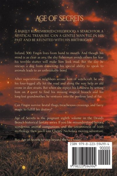 A barely remembered childhood. A search for enchanted treasure. Can a gentle man discover his past and be reunited with his birthright? Ireland, 500. In an ancient land where forgotten tales and mystical wonders abound, a man with a fragmented past embarks on a quest to reclaim his true identity. Fingin, a gentle soul plagued by an abusive childhood, ekes out a meager existence as a fisherman, hiding his inner kindness from the world. Bound by the crippling weight of his stutter, he chooses solitude over the risk of being branded as a fool. Everything changes when he rescues a drowning dog, and an extraordinary bond forms between them. Through his unique gift of communicating with animals, Fingin finds a loyal companion. But his newfound solace is short-lived as superstitious villagers accuse him of dark sorcery. Forced to flee, Fingin and his steadfast canine companion embark on a perilous journey, encountering an enigmatic old crone in desperate need of their assistance. Grateful for their aid, the crone sets Fingin on a quest to unravel the secrets of his past. The journey to recover his missing magical brooch and reunite with his long-lost grandmother leads him into the treacherous realm of the Fae, where danger lurks at every turn. Can Fingin navigate a treacherous landscape of ruthless thugs, treacherous crossings, and enchanting faery magic to uncover the truth about his heritage and fulfill his extraordinary destiny? Age of Secrets is the eighth installment of the Druid's Brooch historical fantasy series. If you yearn for an immersive adventure, where the resilience of the human spirit and the magic of nature intertwine, then journey beyond the veil and embrace the wonder that awaits you. Read Age of Secrets and embark on an unforgettable odyssey! Each book in The Druid's Brooch series can be read in any order as a standalone historical fantasy, allowing you to embark on any mesmerizing journey that calls to your soul.